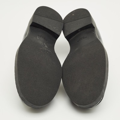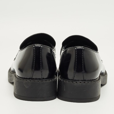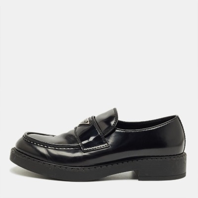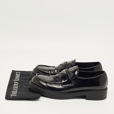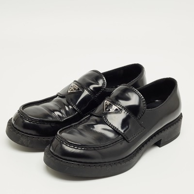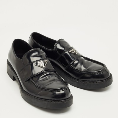 These Prada loafers combine brushed black leather with a subtle platform sole for modern elegance. The slip on design delivers comfort with contemporary style. Perfect for elevating everyday footwear.
