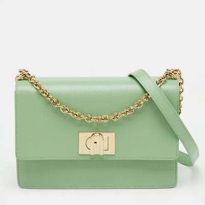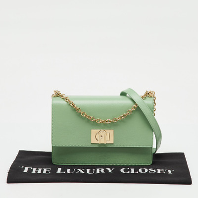 The Furla 1927 Crossbody Bag charms with its compact form and pale green hue. Crafted in smooth leather, it’s defined by the signature turn lock clasp and delicate chain strap. Perfect for day to night transitions, it radiates understated Italian grace.