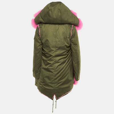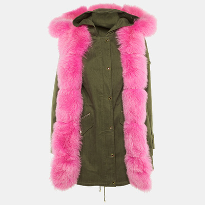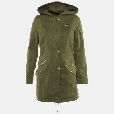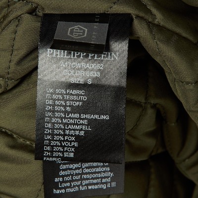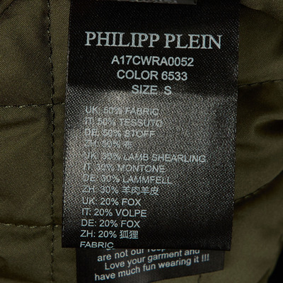 Philipp Plein infuses rugged outerwear with luxury edge in this double layer jacket. Designed in khaki green cotton and trimmed with fur, it offers a bold fusion of functionality and high fashion. Statement hardware and meticulous tailoring embody the brand’s rebellious refinement.