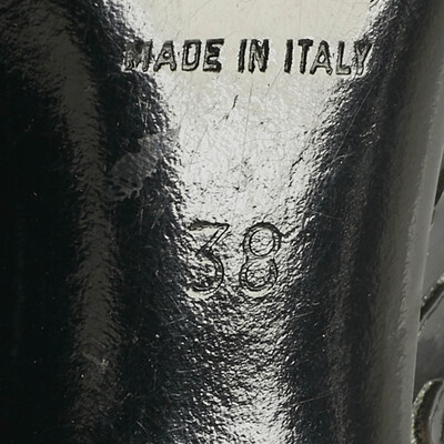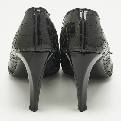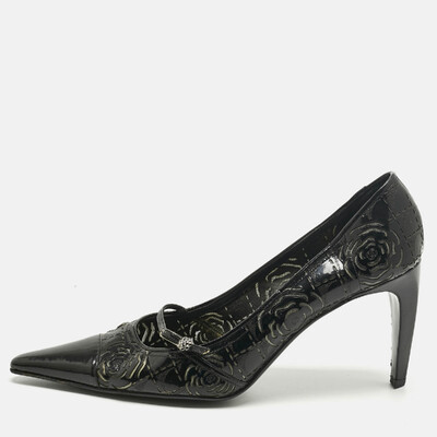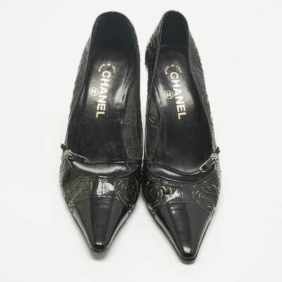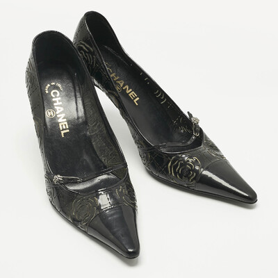 A study in light and reflection — the kind only Chanel could capture. These black patent pumps gleam like wet ink, their pointed toes cutting a sharp, graceful line. Camellia cutouts trace soft shadows across the leather, blooming quietly with each step. They feel cinematic, like the shoes you’d slip on before walking into a night that promises to remember you.
