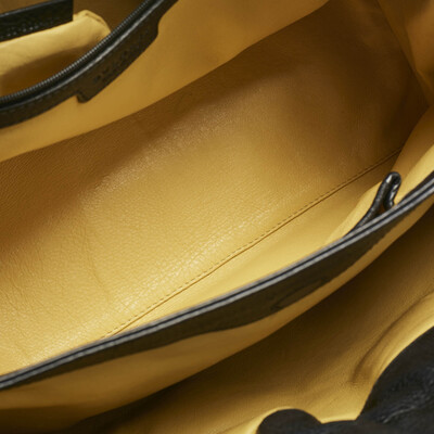 The Bvlgari Twist Tote reimagines form through texture, leather drawn into soft folds, anchored by signature gold rings. Its dual handles, lined compartments in yellow, and relaxed shape make it a functional pick for everyday use.