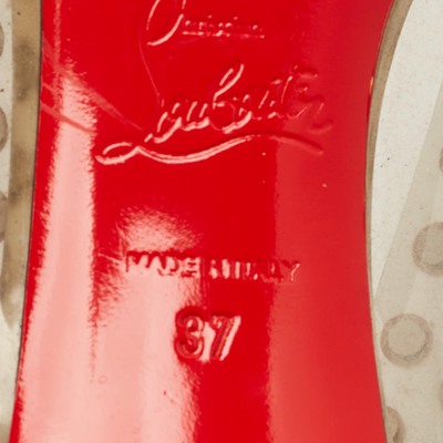 These Christian Louboutin pumps feature glossy beige patent leather in the coveted peep toe Private Number silhouette. Finished with the iconic red sole and chic spike detailing, they will be a beautiful addition to your wardrobe.