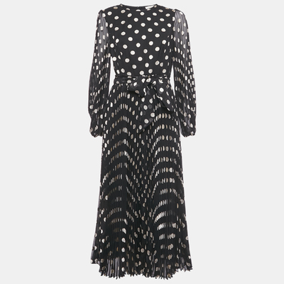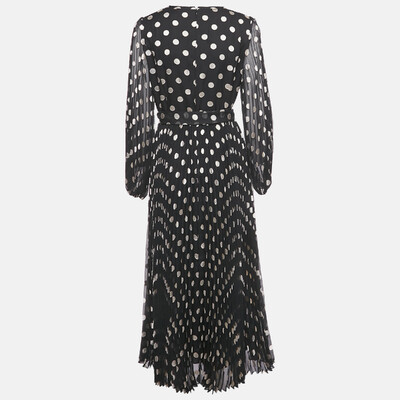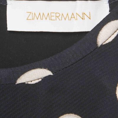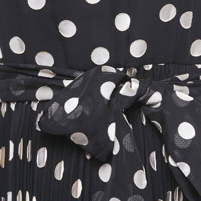 Zimmermann’s midi dress in black plissé crepe captures romantic whimsy with a timeless twist. Polka dots dance across the flowing silhouette, while sunray pleating adds graceful texture. Perfect for garden soirées or city evenings, it epitomizes the label’s effortless, feminine aesthetic.