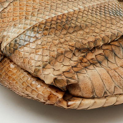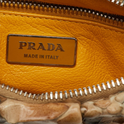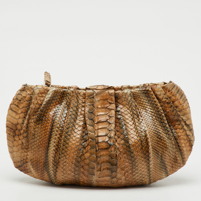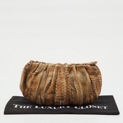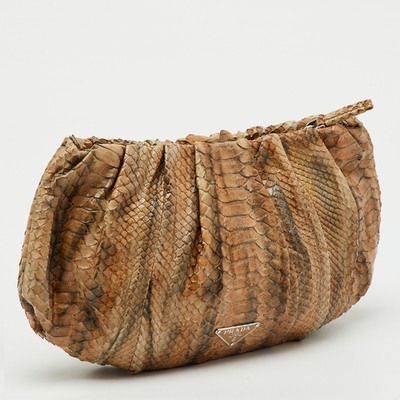 Exuding exotic elegance, this Prada clutch is crafted from genuine python in rich tones of brown and grey. Its sleek zip design offers secure storage for evening or travel essentials. A luxurious piece that adds instant sophistication.