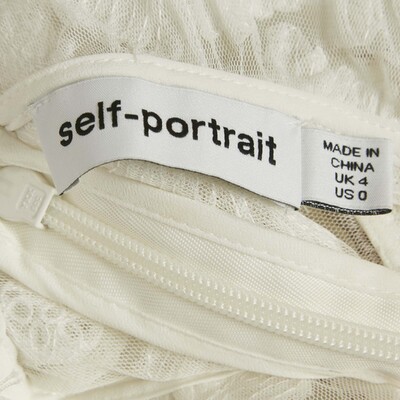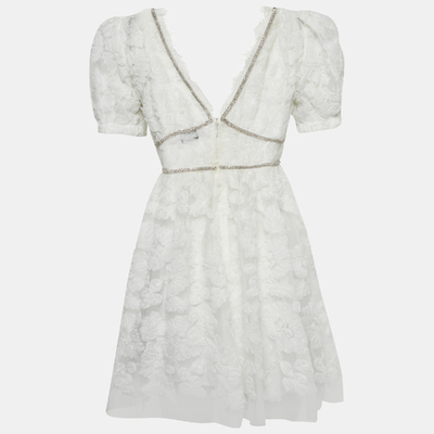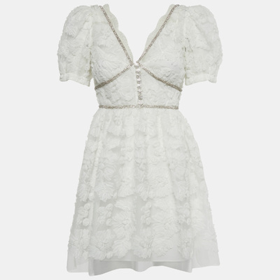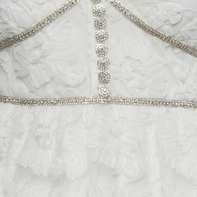 Self Portrait’s white mini dress exudes refined femininity through intricate lace and delicate crystal ribbon detailing. The fitted silhouette, balanced with subtle sparkle, captures the brand’s signature blend of romance and modern polish. Ideal for celebratory moments or elegant evenings, it’s a timeless piece that radiates understated glamour.