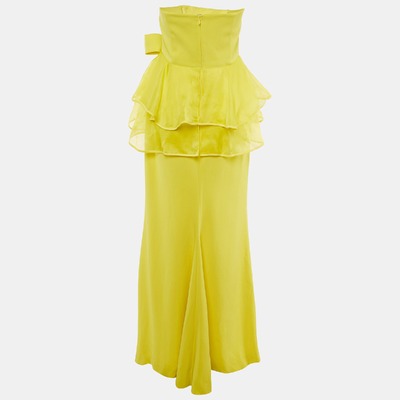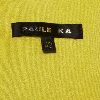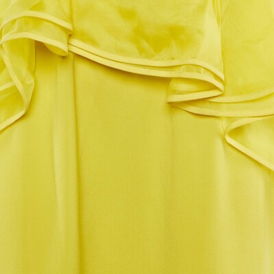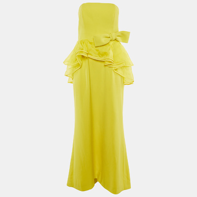 Radiant in sunshine yellow, this strapless Paule Ka gown features an oversized bow and asymmetric frill detailing for a dramatic, couture inspired finish. Crafted from smooth crepe, it flows elegantly with every step. A show stopping choice for formal events.