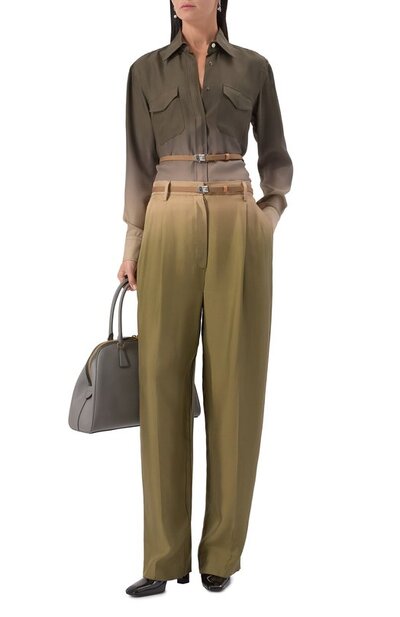Брюки из шелкового твила окрасили в технике деграде. Модель с парными защипами дополнили четырьмя карманами, подчеркнув правый задний фирменной треугольной пластиной.