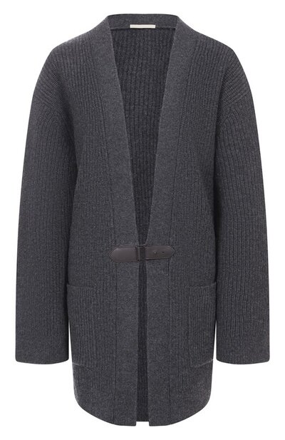 В капсульную коллекцию Gi вошел удлиненный кардиган, застегивающийся кожаным ремешком с кобурной кнопкой. Модель с двумя накладными карманами и спущенной линией плеч связали объемной французской резинкой из чистой мериносовой шерсти.