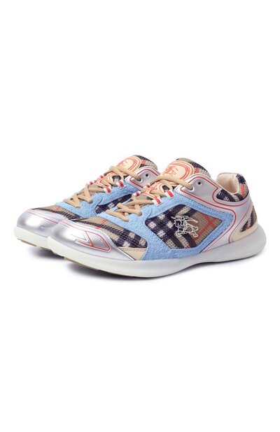 Кеды Matrix из сетчатого текстиля с мотивом Burberry Check укрепили деталями из замши и полимера. Модель на гибкой подошве украсили изображениями Equestrian Knight сбоку и на язычке.