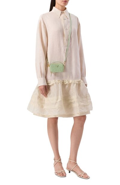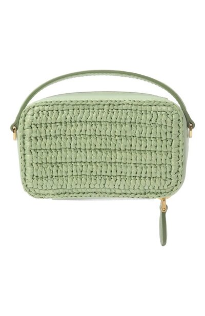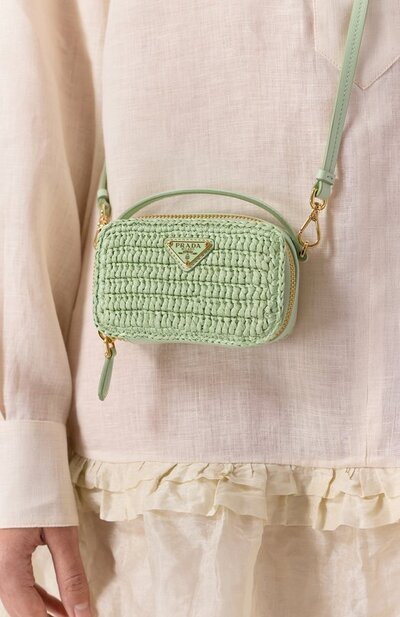 Сумку, связанную крючком из текстиля, напоминающего рафию, дополнили короткой ручкой и съемным плечевым ремнем, выполненными из гладкой кожи. Аксессуар, застегивающийся молнией, украсили знаковым эмалевым треугольником.