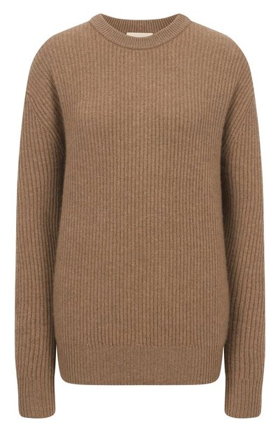 Свитер с круглым вырезом, широким поясом и спущенной линией плеч связали узором в рубчик из кашемировой пряжи. Модель станет основой комфортного образа с джинсами.
