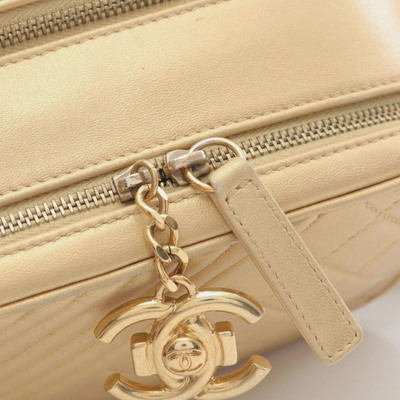 A compact Chanel Coco Boy camera bag in gold lambskin. Features a zip top closure and chain strap for easy wear. Ideal for light carry and daily use with a modern twist on a classic Chanel look.