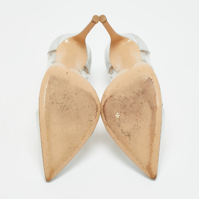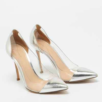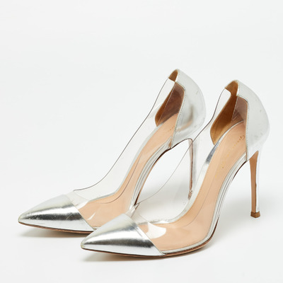 Sleek and modern, these Gianvito Rossi Plexi pumps blend silver leather with transparent PVC for a barely there look. The pointed toe silhouette elongates the legs, while the metallic finish adds a touch of glamour. Perfect for contemporary evening elegance.