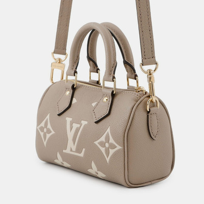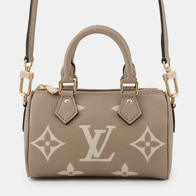 Louis Vuitton elevates compact elegance with the Beige Monogram Empreinte Nano Speedy Handbag, where soft beige tones highlight the supple textured leather. Its refined silhouette and understated luxury make it a versatile statement piece, perfect for effortlessly carrying essentials with modern sophistication.