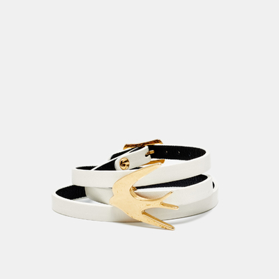 A study in rebellion and refinement, this McQ bt Alexander McQueen bracelet contrasts supple leather with the brilliance of gold tone hardware. The sleek, minimalist form nods to McQueen’s punk inflected design language while retaining a wearable, urban appeal. It’s a versatile piece that brings a subtle edge to crisp tailoring or monochrome ensembles.