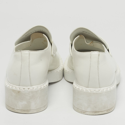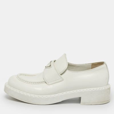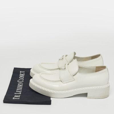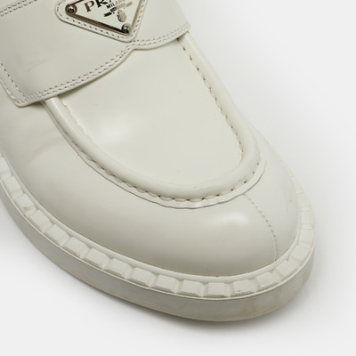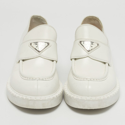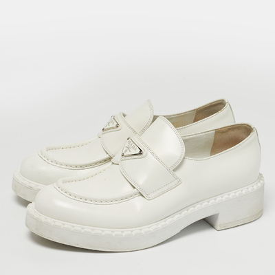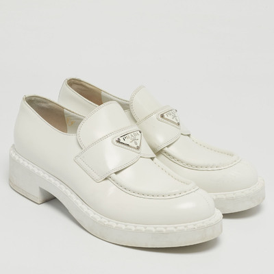 Minimalist and modern, these Prada loafers feature smooth white leather in a clean slip on design. The subtle logo detail adds a touch of sophistication. A versatile choice that pairs effortlessly with both tailored and casual outfits.
