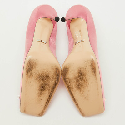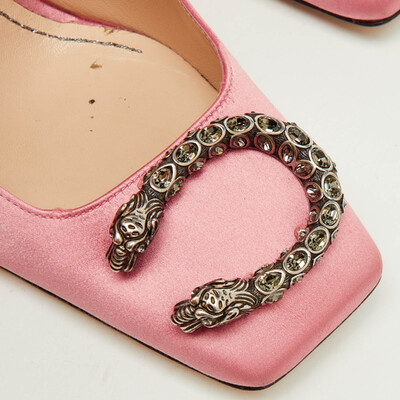 These Gucci pumps bring a touch of romance with their light pink satin and square toe. The antique Dionysus buckle adds a hint of mythic intrigue, contrasting beautifully with the soft finish. They hold their own, whether under crisp suiting or a dress that moves with the night.