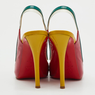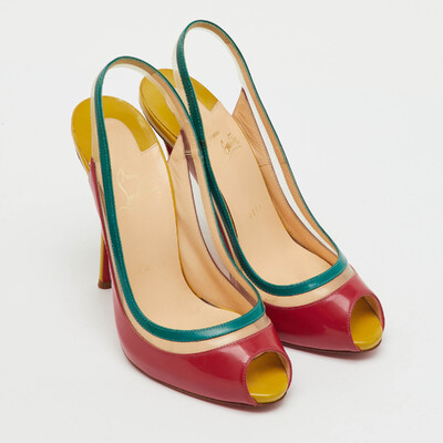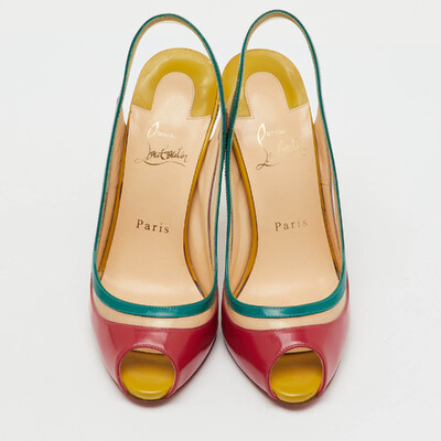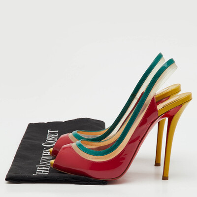 These pre loved Christian Louboutin Paulina sandals combine glossy patent leather with transparent PVC panels, letting color and structure play in tandem. The peep toe reveals a hint of movement, while the slingback hugs with precise comfort. The iconic red sole follows every step like a signature whisper, making them a wearable piece of modern art that moves as boldly as you do.