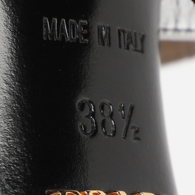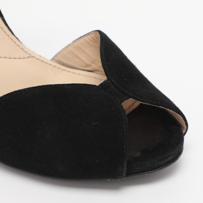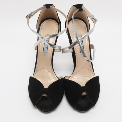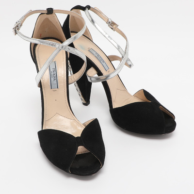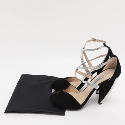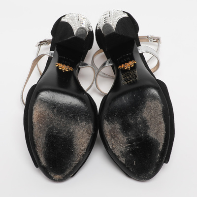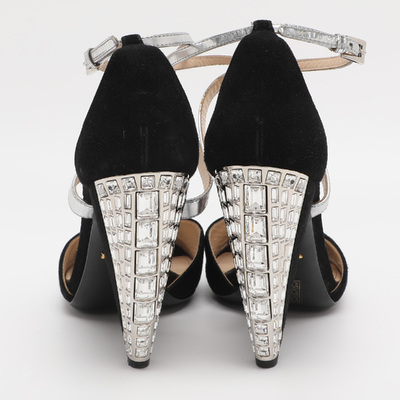Prada crafted these black suede sandals with a sculptural heel inlaid with gleaming crystals, a detail that turns them into jewelry for the feet. The silver ankle strap adds contrast and lightness, making them the kind of pair that works just as beautifully with an evening gown as it does with sharp, cropped tailoring.