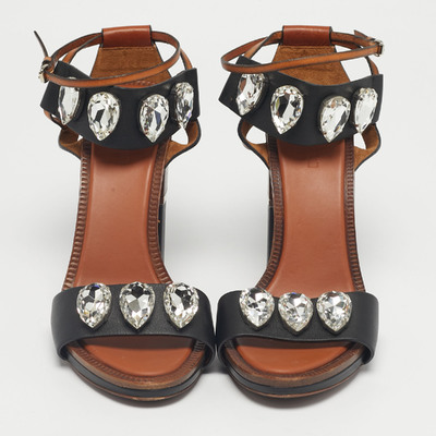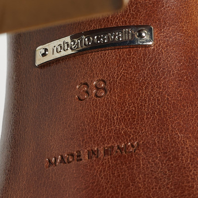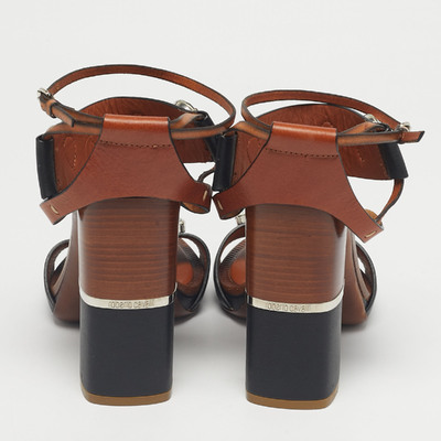 These authentic Roberto Cavalli sandals are crafted from brown and black leather with crystal detailing across the straps and ankle. The block heel and mixed tones make them luminous enough for evening, grounded enough for day.