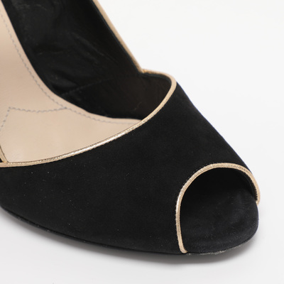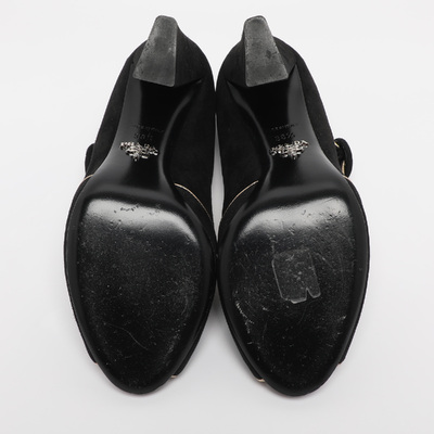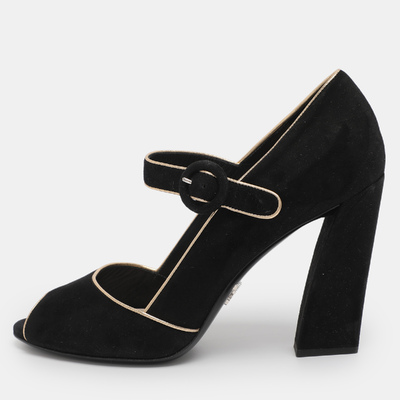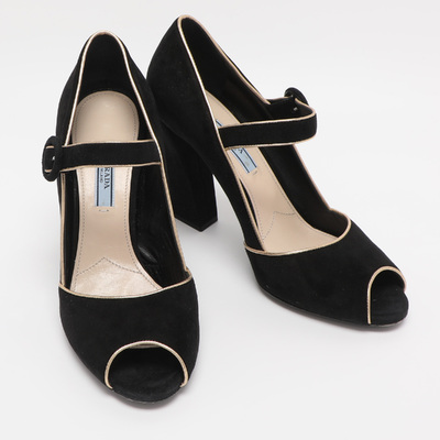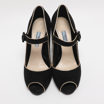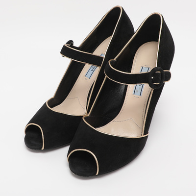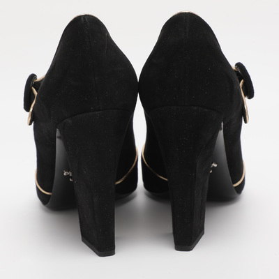 The Mary Jane takes on a darker, sharper mood under Prada’s hand. Black suede softens the block heel’s weight, while gold piping sketches out each curve like a drawing in motion. The rounded cutout at the toe and single strap nod to nostalgia, yet the proportions feel defiantly modern.