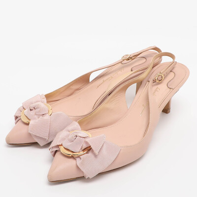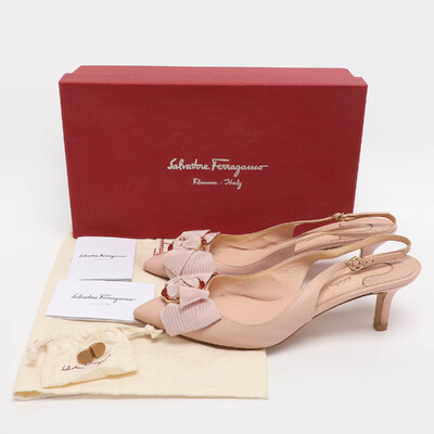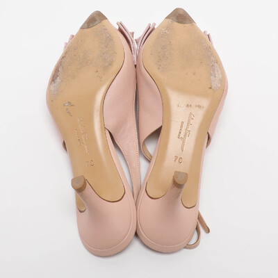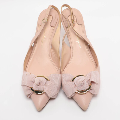 Ferragamo’s slingback sandals in soft pink leather feature a signature bow at the toe. Balanced proportions and smooth leather create a graceful line from heel to toe.