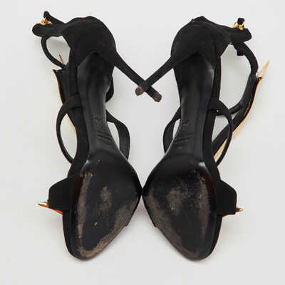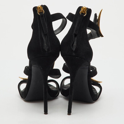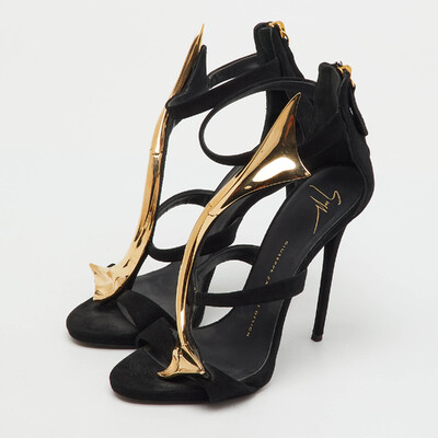 Heels that are distinctly Giuseppe Zanotti. Fashioned in black suede and lifted on sky high heels, these sandals are for striking a pose every chance you get. And that fluid gold accent that frames like jewelry? Just fabulous