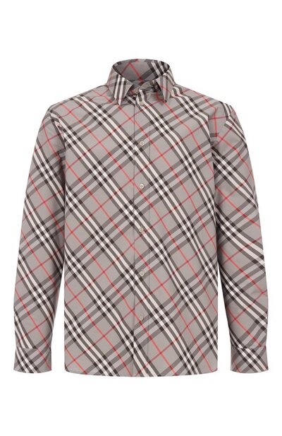 Рубашку кроя Classic fit выполнили из хлопковой ткани с архивным принтом Burberry Check оттенка Mauve grey. Модель с бантовой складкой сзади, как и прямоугольные манжеты, застегивается перламутровыми пуговицами.