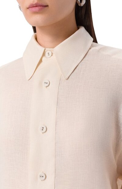 Платье-рубашку со спущенной линией плеч и прямоугольными манжетами выполнили из чистого льна. Модель с расклешенным воланом украсили накладкой в виде фирменного треугольника под воротником на спинке.