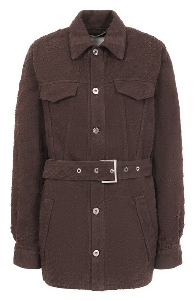 Для изготовления куртки с отложным воротником использовали неэластичный деним с фактурным узором, созданным лазером. Модель с прорезными боковыми карманами и нагрудными с клапанами дополнили поясом с серебристой прямоугольной пряжкой.