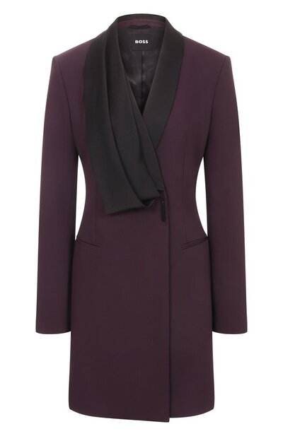 Платье-смокинг Danjana с застежкой на потайные крючки и прорезными боковыми карманами выполнили из твила на основе шерсти первого пострига. Шалевый воротник модели отделали шелковистым крепом с драпировкой.