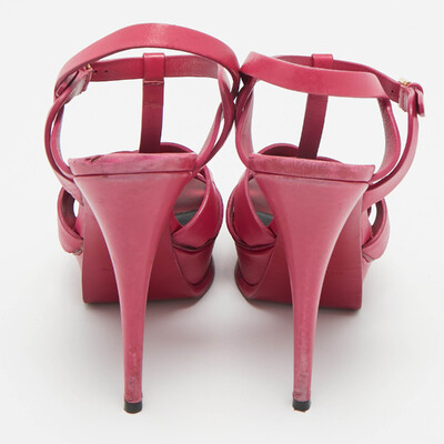 With a Barbie pink glow, these Saint Laurent platform sandals turn heads with their sculpted height and intertwined front straps. The glossy finish and high heels bring that effortless party mood the brand is known for.