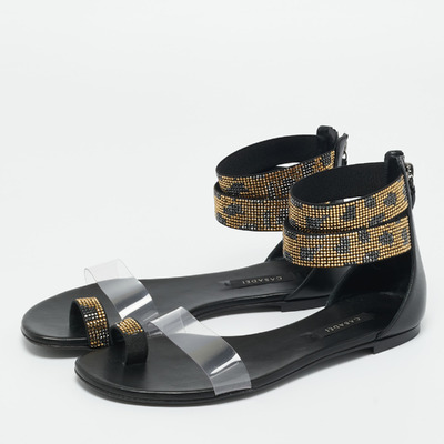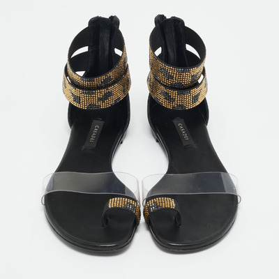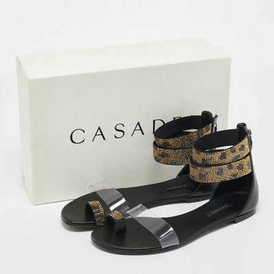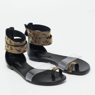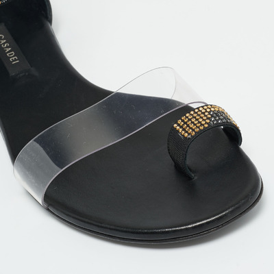 Casadei brings understated glamour to summer footwear with these crystal embellished flat sandals. The combination of smooth black leather and transparent PVC lends a contemporary edge, while the glistening detailing offers a touch of brilliance. They pair effortlessly with vacation ready dresses or tailored resort separates.
