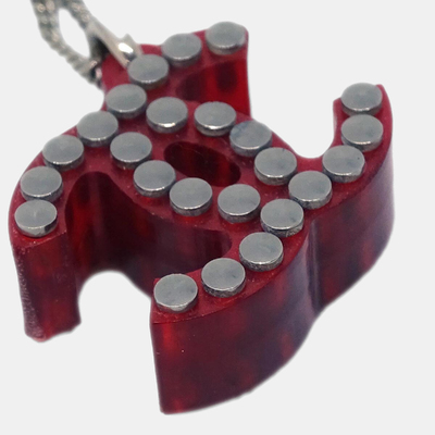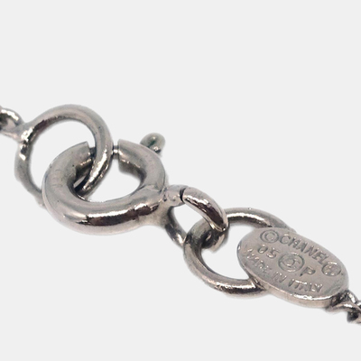 This Chanel necklace features a CC logo pendant in silver and red acrylic, suspended from a delicate chain. Lightweight and eye catching, it’s an easy way to add Chanel’s signature charm to any outfit.