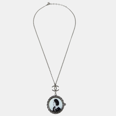 A Chanel Mademoiselle pendant necklace in silver tone metal with a fine chain. The design pays tribute to the brand’s heritage with a subtle yet distinct charm. Ideal for layering or wearing alone.