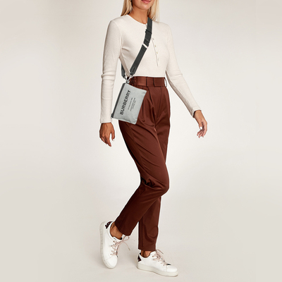 Effortlessly merging function with refinement, Burberry’s Callum crossbody bag is designed in grey and black canvas with smooth leather trims. The utilitarian shape is enhanced by logo accents and sleek zip closures, reflecting the house’s modern British sensibility. Its compact form holds essentials securely, making it ideal for daily commutes or travel. Style it against neutral layers or outerwear to channel understated urban polish.