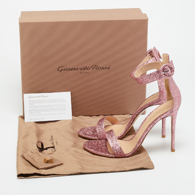 These Portofino sandals reimagine one of Gianvito Rossi’s most celebrated silhouettes in glistening pink lamé. The slender ankle strap and high stiletto heel create a balanced, feminine form. Their luminous finish makes them the ideal choice for soirées or celebrations that call for subtle sparkle.