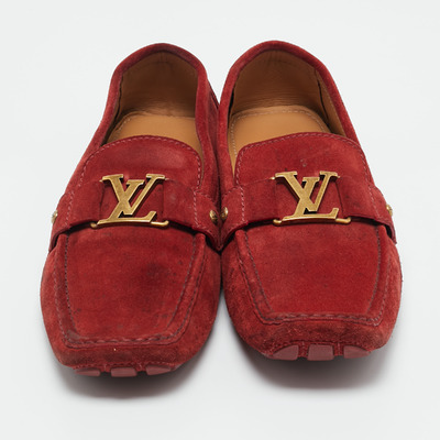 These Louis Vuitton Monte Carlo loafers are crafted from rich burgundy suede, featuring the signature LV logo detail. Soft and lightweight, they combine timeless elegance with comfort. A refined staple for discerning wardrobes.
