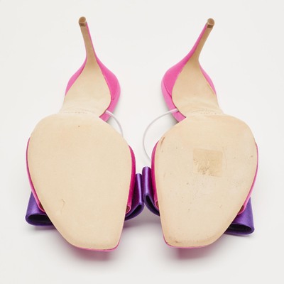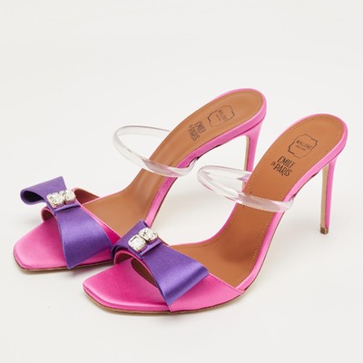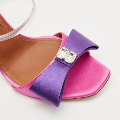Petals of pink fold like a miniature evening gown across the foot, the purple bow with crystals resting like a delicate flourish at the center. The clear strap keeps the design neat while the 10 cm heel keeps the silhouette sharp. Choose them for dressing up denim or to complement a flowy dress.