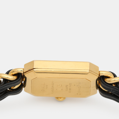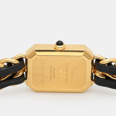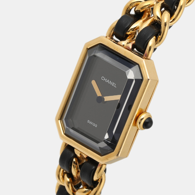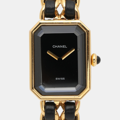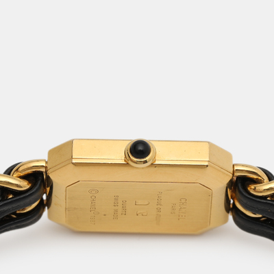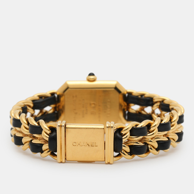 Elegant and iconic, Chanel’s Premiere H6951 watch features a black leather strap intertwined with gold plated stainless steel links. Its minimalist 20 mm dial embodies feminine grace and Parisian allure. A luxurious accessory that adds subtle glamour to any look.