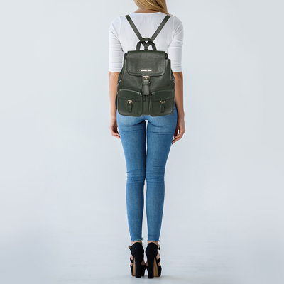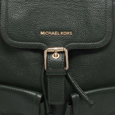 Green leather folds and shifts as the MICHAEL Michael Kors Susie backpack rests lightly on the back, the drawstring and flap closure tucking belongings safely inside. Hands reach for the top handle, or straps adjust effortlessly as it moves through the day.