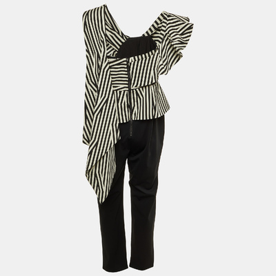 Self-Portrait Black/White Crepe Asymmetrical Striped Ruffle Jumpsuit M 1228298 - 1