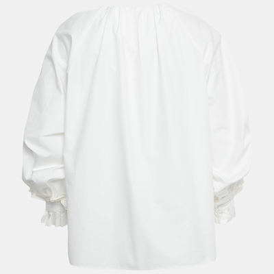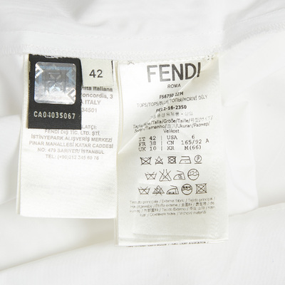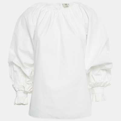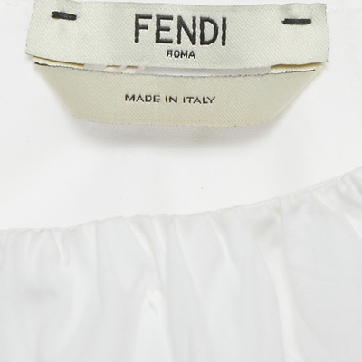 This Fendi womens blouse turns simplicity into a statement. Tailored in white cotton with a round neckline, relaxed fit, and balloon like sleeves, it’s a piece that can shift moods effortlessly, from polished workwear to evening styling.