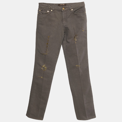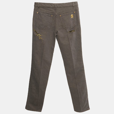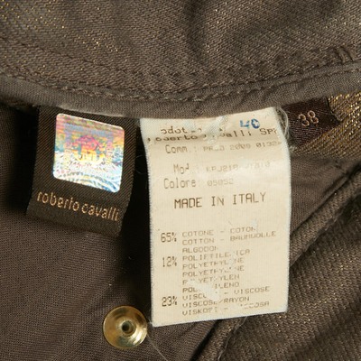 Add a touch of glamour to casualwear with these Roberto Cavalli straight leg jeans in brown and gold denim. Featuring distressed accents and metallic detailing, they reflect the brand’s edgy luxe aesthetic. A standout choice for fashion forward wardrobes.