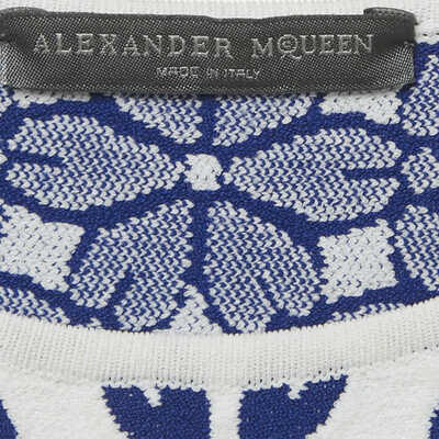 Alexander McQueen mini dress is made from stretch knit in white and blue with a floral pattern. Fitted and modern, it highlights the maison’s structured femininity. A distinctive piece for refined edits.