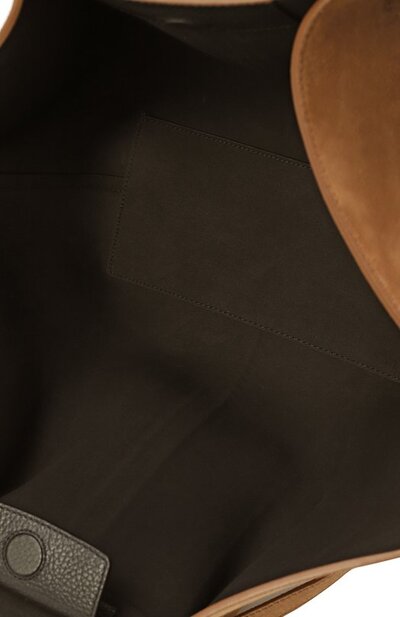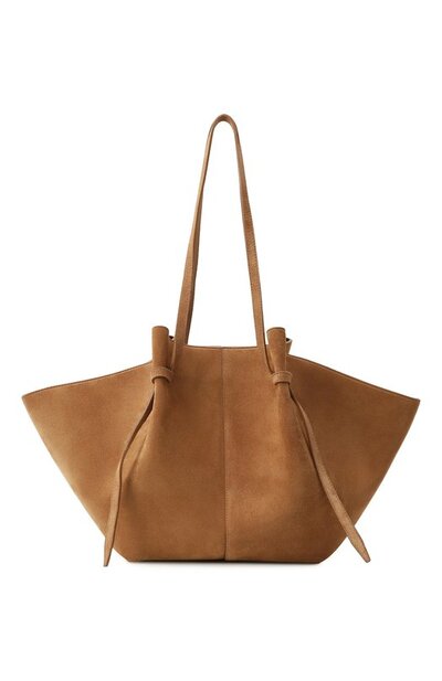 Сумку Mochi с удлиненными регулируемыми ручками выполнили из итальянской замши, сертифицированной LWG. Модель с накладным внутренним карманом застегивается потайным магнитом.