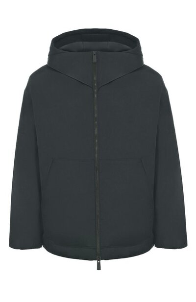 Нейлоновую куртку с регулируемым капюшоном утеплили полиэстером, украсив левый рукав брендированным патчем в тон. Помимо накладных боковых карманов предусмотрели внутренний. Модель со спущенной линией плеч застегивается встречной молнией.