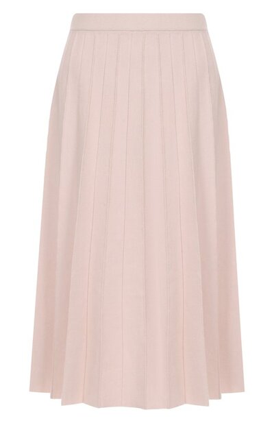 Для изготовления плиссированной миди-юбки использовали трикотаж на основе шерсти. Благодаря эластичному широкому поясу лаконичная модель обходится без застежки.