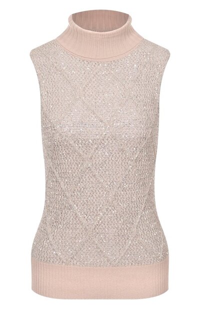 Для создания топа с высокой горловиной и эластичным поясом использовали пряжу из шерсти Extrafine, полиамида и полиэстера. Спинку выполнили в рубчик, а спереди сформировали ажурный ромбовый узор, подчеркнув его пайетками.