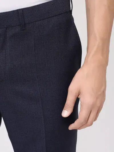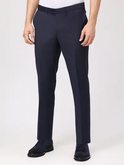 -Брюки классического кроя и посадки с поясом со шлевками, прорезными карманами, застежкой на молнию и пуговицу, графичными стрелками.